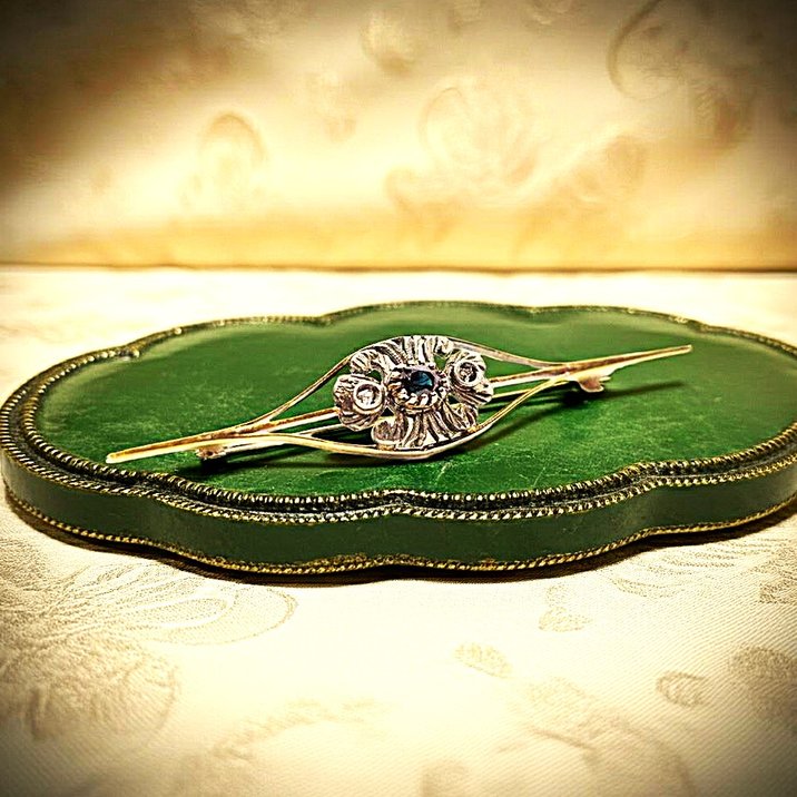 18kt yellow gold and silver antique brooch with diamonds and sapphire. M. 6.02 cm. x 1.01 cm. W. 4.68 grams.