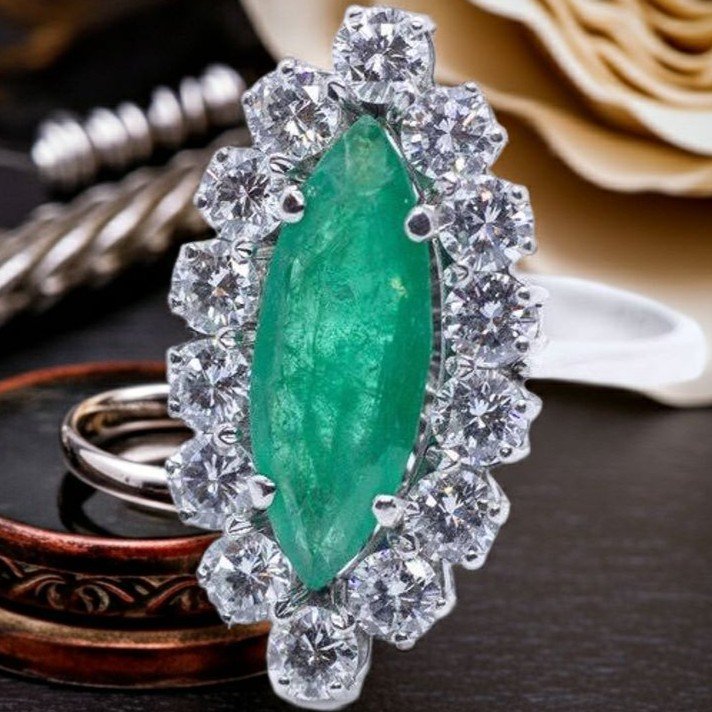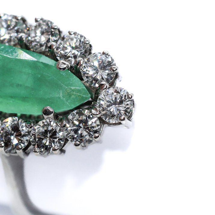 18kt white gold ring with "navette" cut emerald and fourteen top quality round cut brilliant diamonds. It's provided of Gemological Certificate.