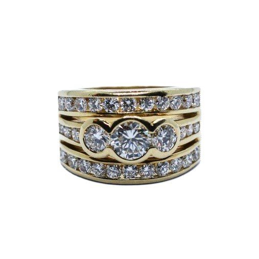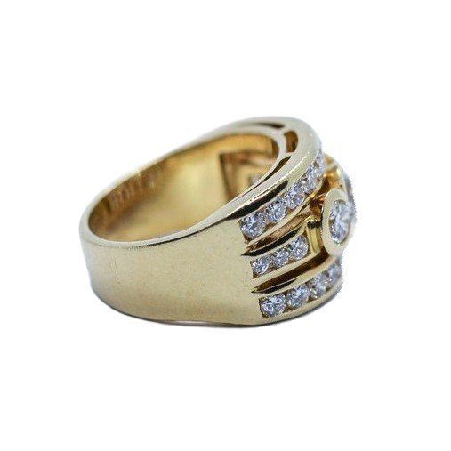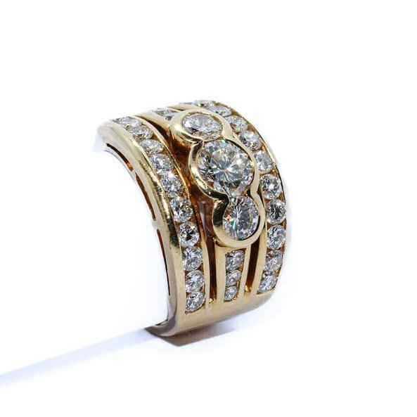 18kt yellow gold band ring, round brilliant cut diamonds. The main stone is 0,72 carats, clarity:VS2, color:G/H,next to it two round brilliant cut diamonds, 0,25 carats approx. each one, clarity from VVS to VS and grade of color F/G. Moreover there are other 28 round brilliant cut diamonds for more than one and half carats in total. The ring is provided of Gemological Certificate.