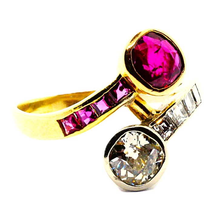 18kt white and yellow gold bypass ring, 1 and half carats top quality diamonds in total and 1,80 carats in total the rubies. It's provided of Gemological Certificate.