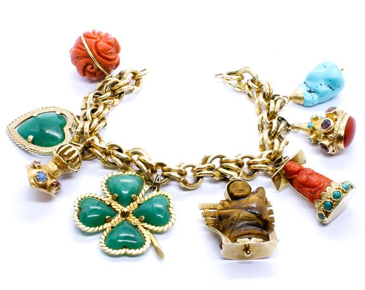 Gorgeous 50's charm bracelet.18kt yellow gold with jade, coral, turquoise, tormalins and tiger's eye stone. 114,65 grams.
