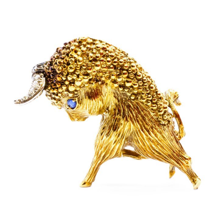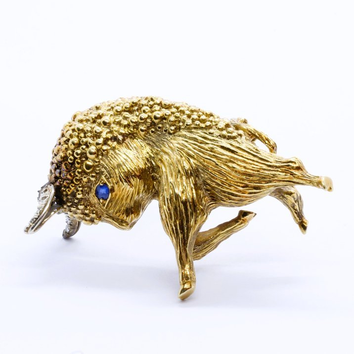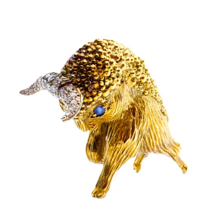18kt yellow gold diamonds and sapphire buffalo shaped brooche, 21,56 grams. It's a gorgeos example of goldsmith craftsmanship of the 50's.