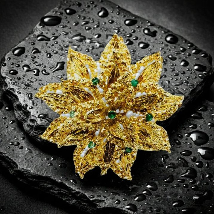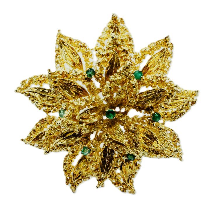 Gorgeous flower shape 18 kt yellow gold brooche, seven emeralds set, completely handmade, weight is 22,59 grams. 1950 circa.
