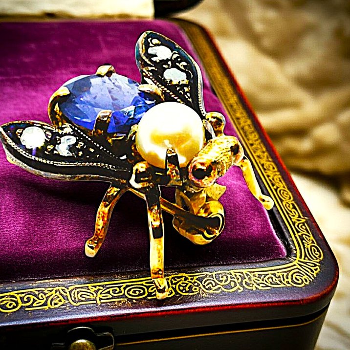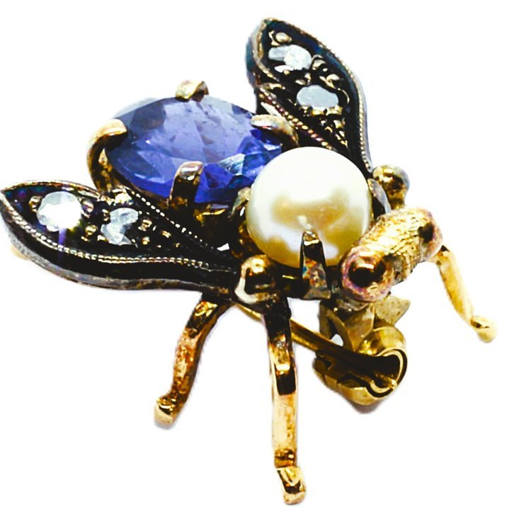 Antique brooch, gold, silver, diamonds, pearl and sapphire. 1900 circa.