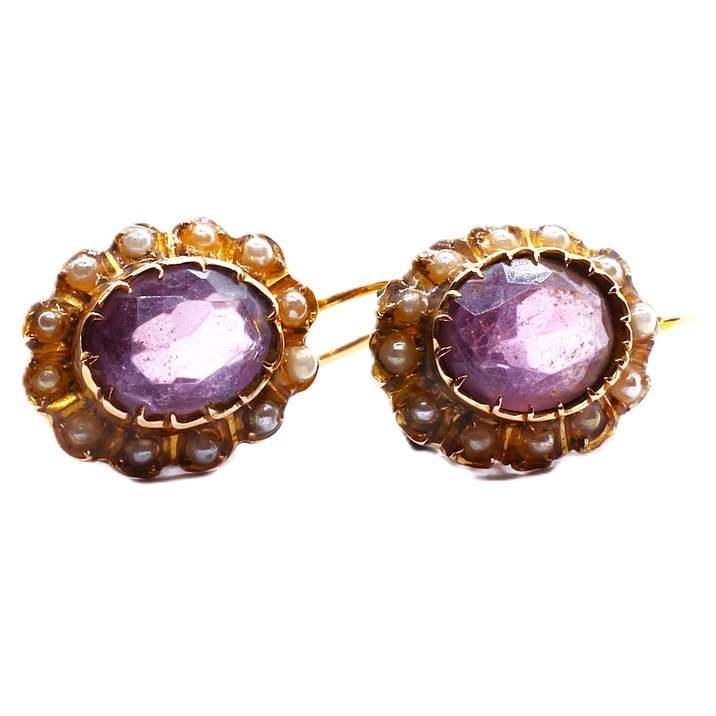18kt yellow gold, amethyst and micropearls, 1900 circa.