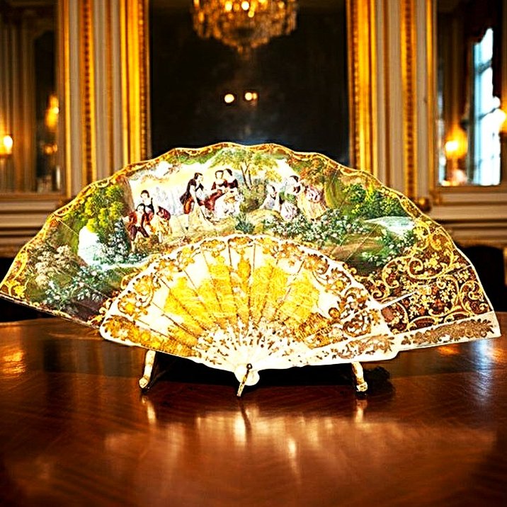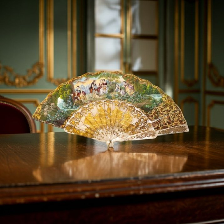 Antique folding fan painted on both sides with mother of pearls slats and pure gold applications. On one side are represented court scenes and on the other common ones. 28,50 cm. x 51,00 cm.