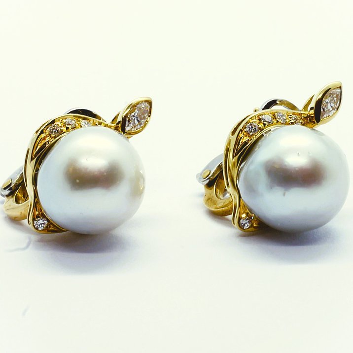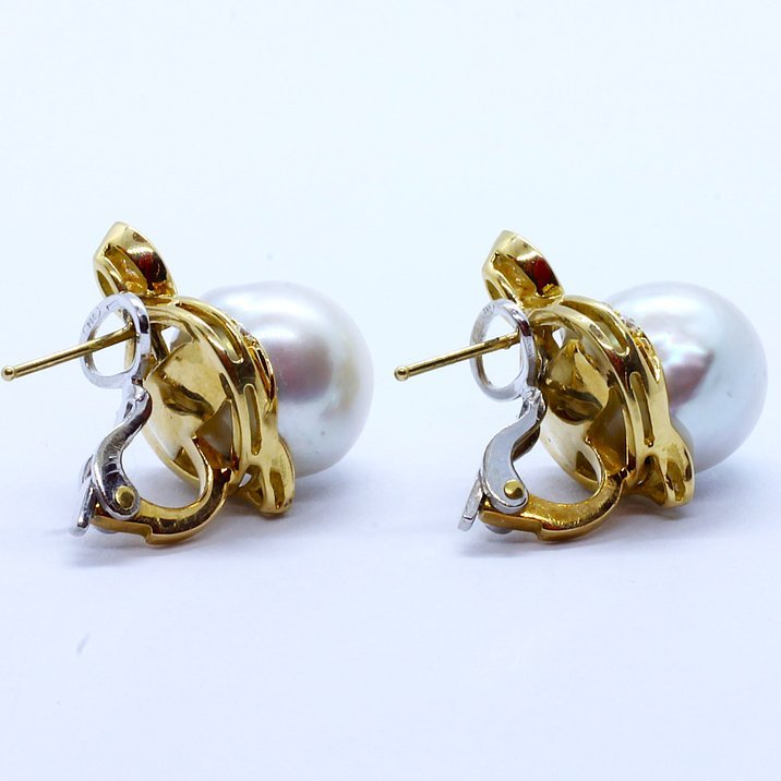 18kt yellow and white gold australian pearls earrings, claw set round brilliant cut diamonds, mm 16,0 the pearls and 12,81 grams is the total weight.