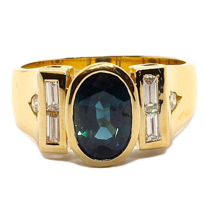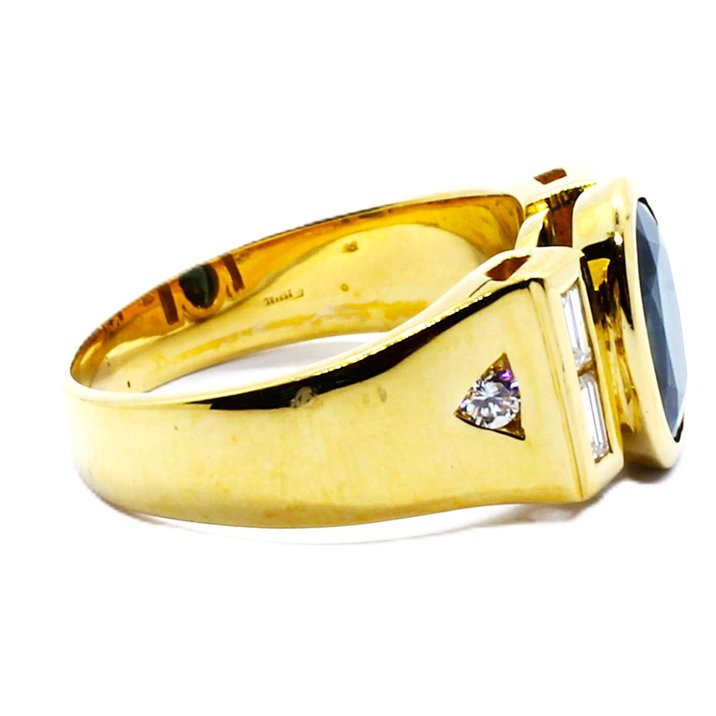 5,00 carats sapphire and top quality baguette and round brilliant cut diamonds 1 carat in total all mounted on 18kt yellow gold, the finger size is 58 and 9,40 grams is the weight.