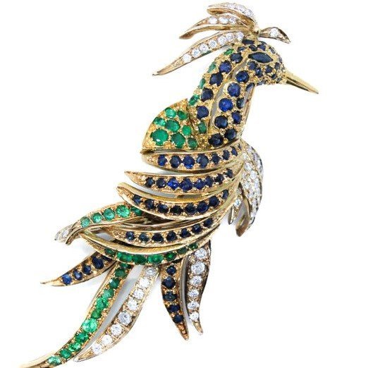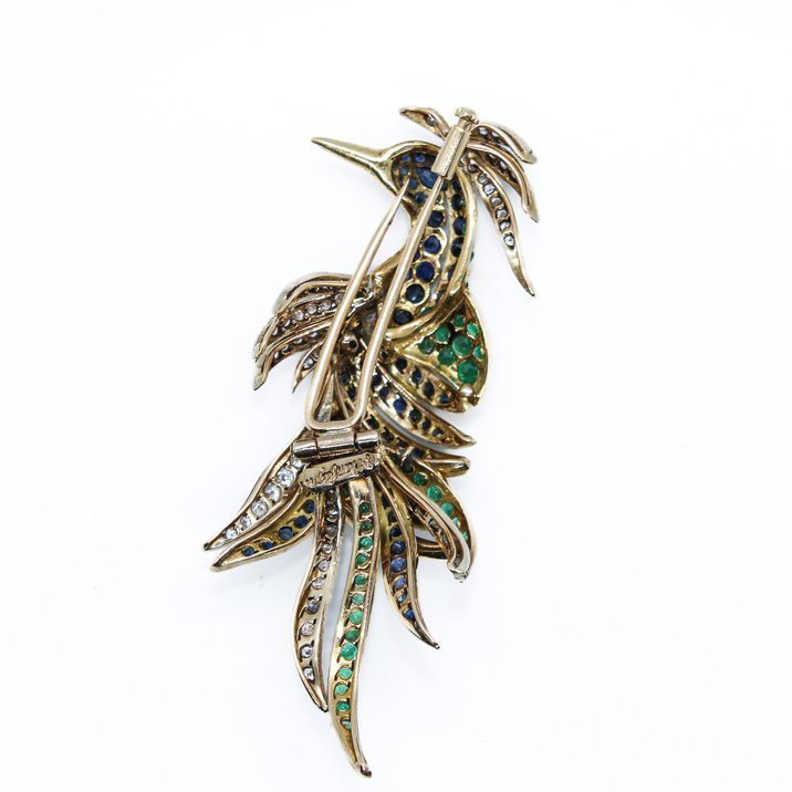 18kt yellow gold brooch with emeralds, sapphires and round brilliant cut diamonds. 6,75 mm. x 27,79 mm, goldsmith's signature it's engraved. Max. length 67,65 mm. Max. width 27,79. The weight is 19,18 grams.
