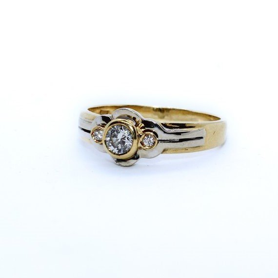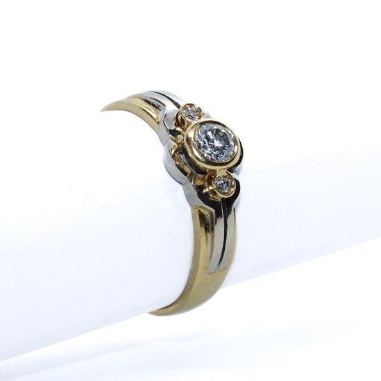 18kt yellow and white gold with round brilliant cut diamonds. The main one is almost 0,25 carats. The ring size is56/16, the weight 4.02 grams.