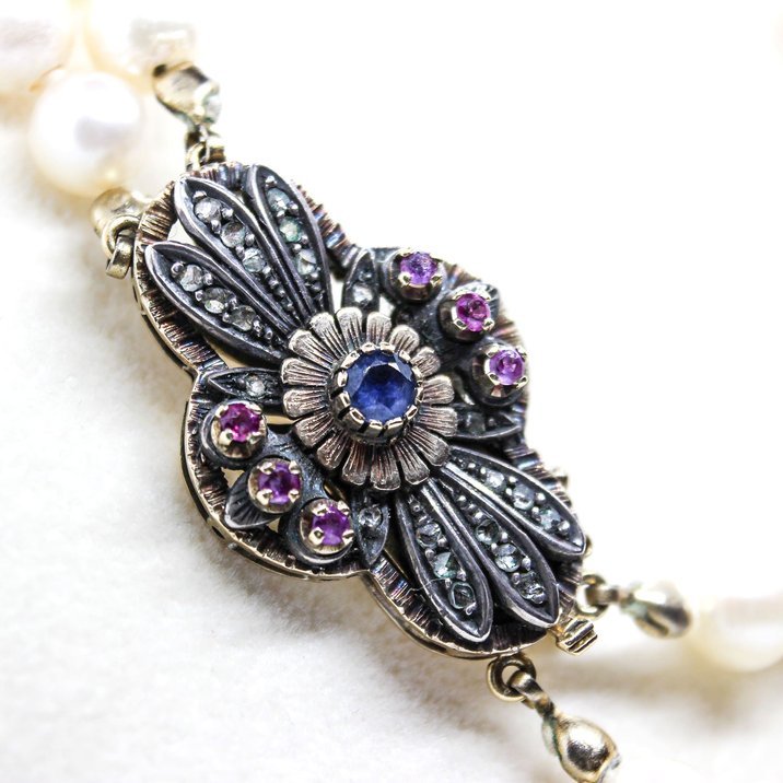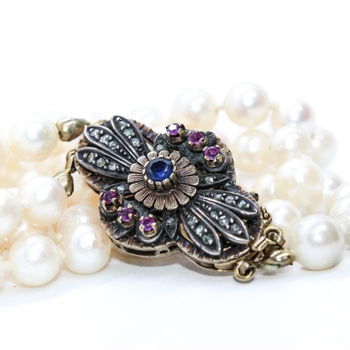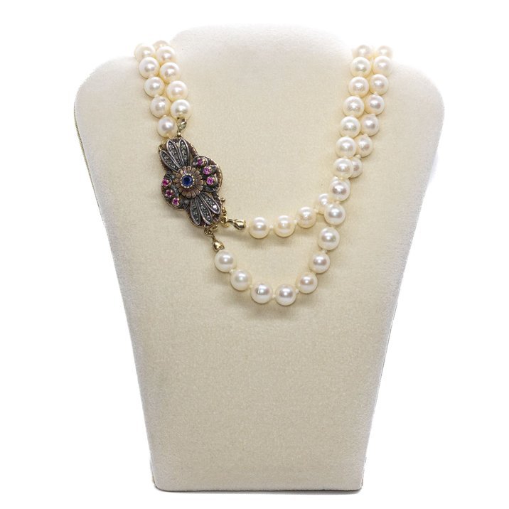 Double strand of pearls with a gold, silver, diamonds and rubies antique clasp. More than 7,00 mm. each one, beautiful shine and sphericity.