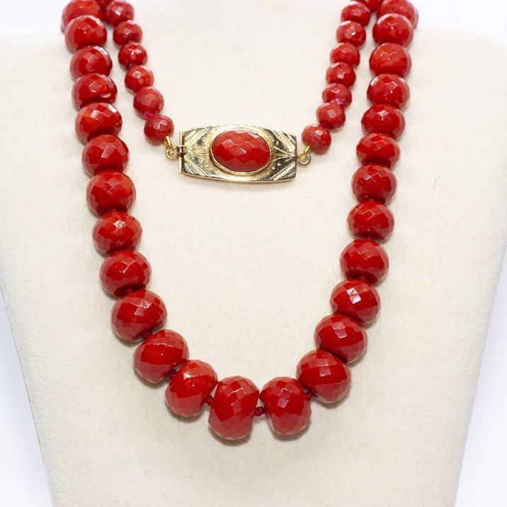 Gorgeous sardinian faceted and climbing coral necklace with 18kt yellow gold clasp. The coral, going from 6,52 mm to 12,57 mm, has been polished and inserted recentely. Weight 83,06 grams.
