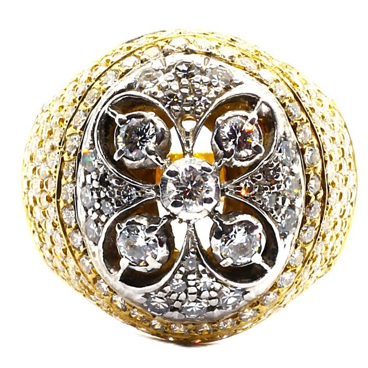 18kt yellow and white gold dome like ring featuring 2,50 top quality round and single cut diamonds, the weight is 13,66 grams and the always changeable finger size is 65.