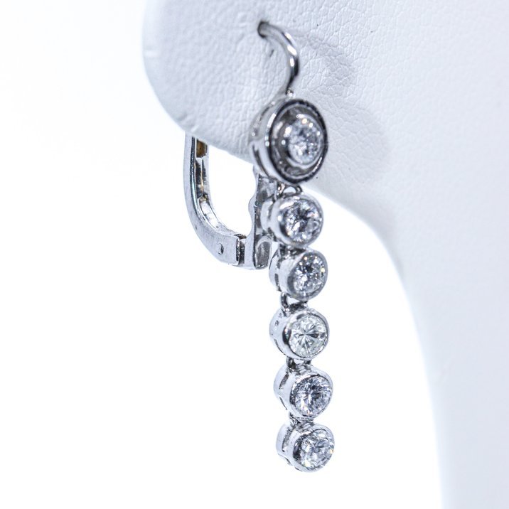 18kt white gold dangling earrings with good quality shape and cutting style round brilliant diamonds, 0,85 carats circa, lenght 3,0 cm, weight g. 4,21.