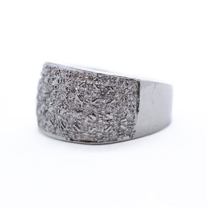 14kt white gold ring paved with 52 top quality round brilliant cut diamonds for a total carats of approx. 1,04. The ring size is 58/18 and the weight is 6,84 grams.