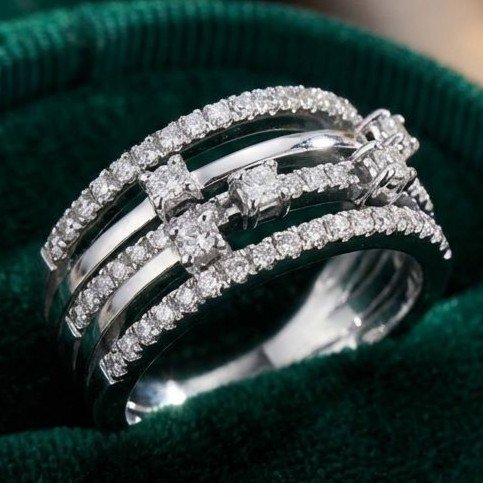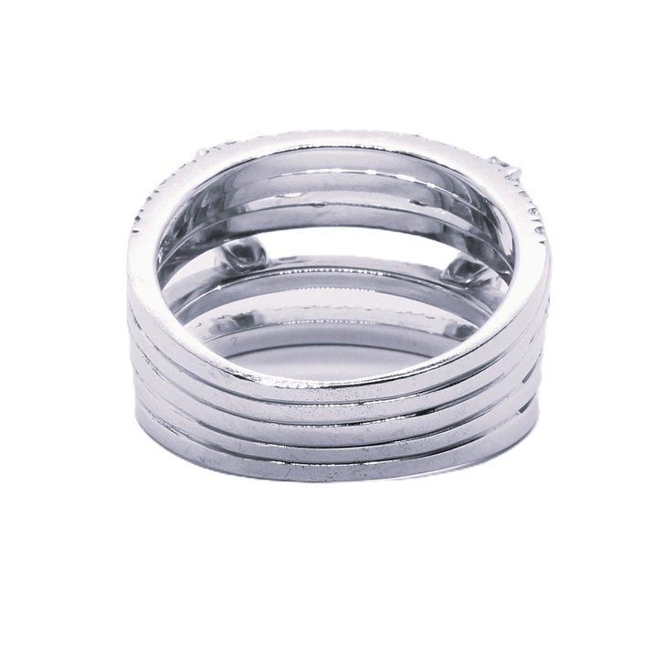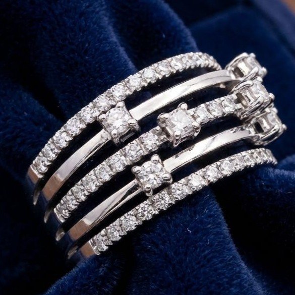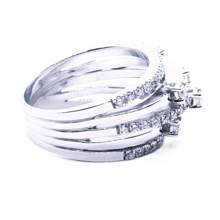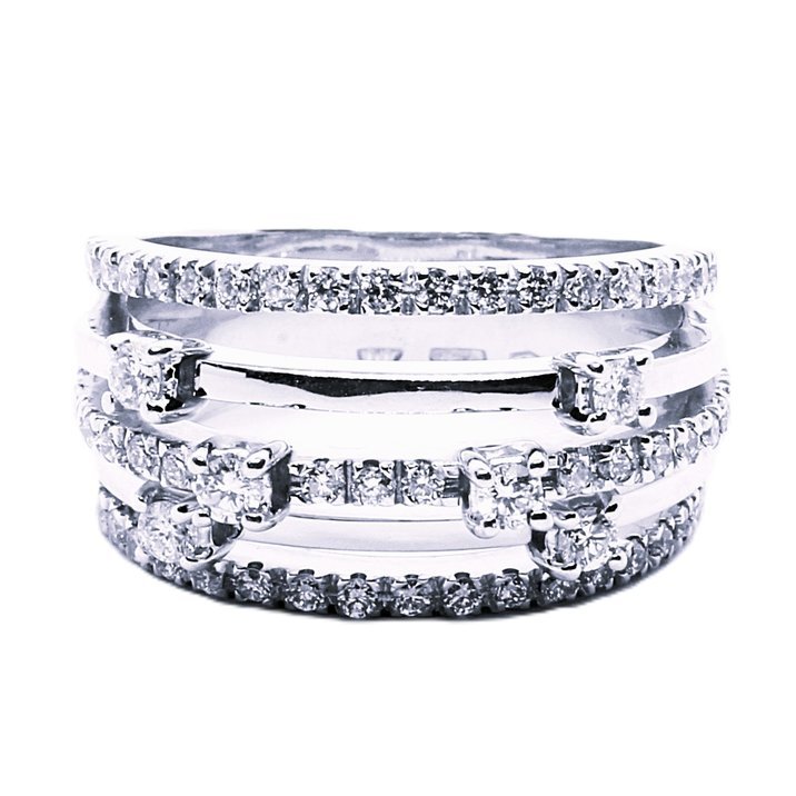 18kt white gold ring, one carat top quality round brilliant cut diamonds, weight 12,45 grams.