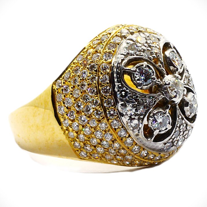 Anello a cupola anni 50 in oro giallo e bianco 18kt. Porta incastonati sul gambo e nella parte centrale diamanti di eccezionale purezza tagliati sia "single cut" che "round brilliant" ed è proprio la differenza tra i due tagli, unita alla presenza di due ori di diverso colore, a creare particolarissimi giochI di luce sul gioiello. La caratura complessiva dei diamanti (da o,10 ct a 0,01 ct) è di 2,5 carati circa ed il peso totale dell'anello è di 13,66 grammi mentre la misura al dito (sempre modificabile) è 25/65.