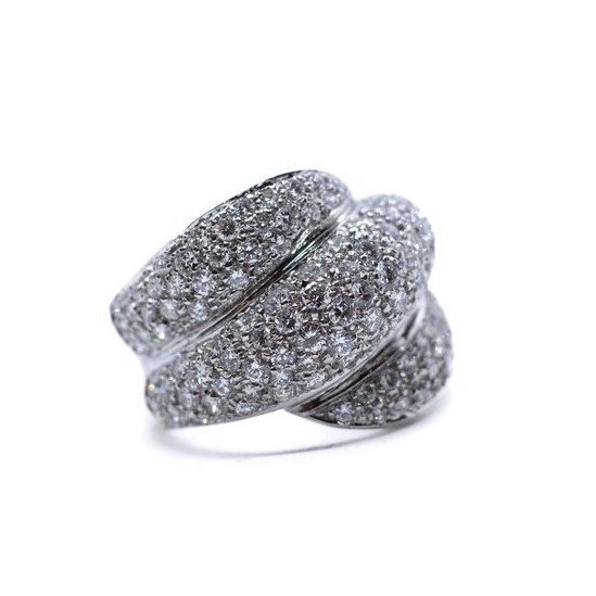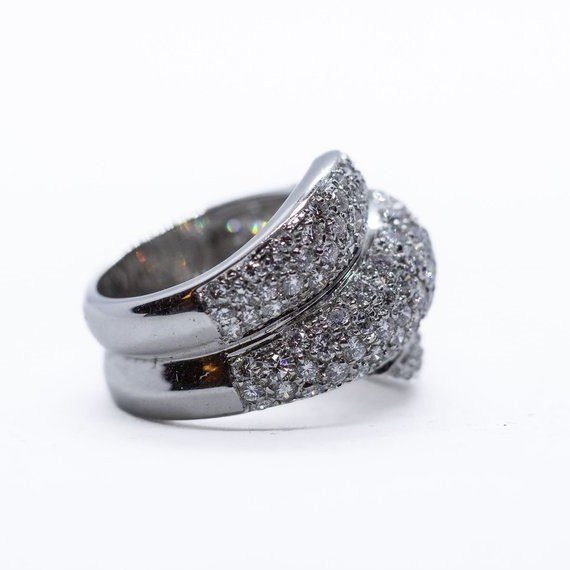 Anello a fascia intrecciata in oro bianco 18kt con pavè di diamanti taglio brillante di ottima qualità per una caratura complessiva di 2 carati circa. Misura14/54. Grammi 16,36.