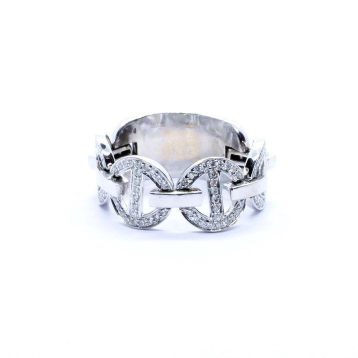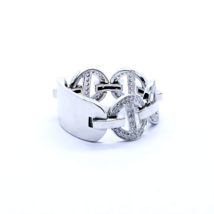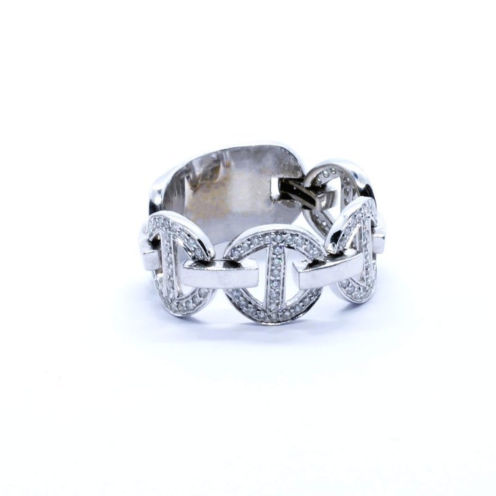 Anello a fascia morbida in oro bianco 14kt con 96 diamanti taglio brillante per un totale di 0,50 ct. scritta all'interno del gambo dell'anello. La misura (sempre modificabile) è 21/51. Il peso è di grammi 7,21.