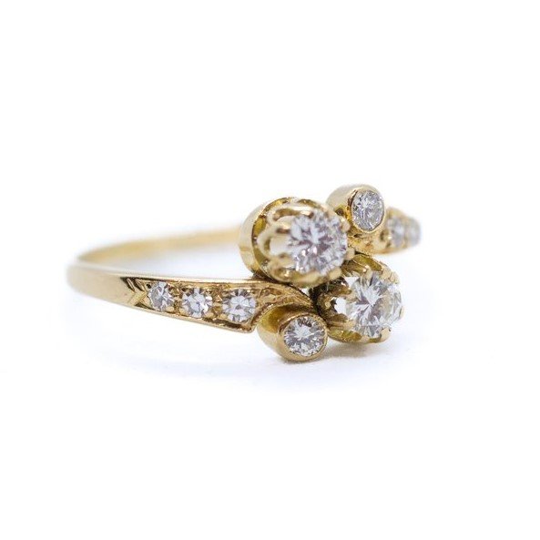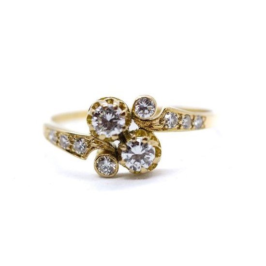 Anello in oro giallo 18kt con sei diamanti tg. rosetta e altri quattro diamanti di ottima qualità taglio round brilliant per una caratura totale e complessiva di 0.45 carati circa. La misura dell'anello (sempre modificabile) è 18/58 ed il peso è di 2.60 grammi. Anni 40.