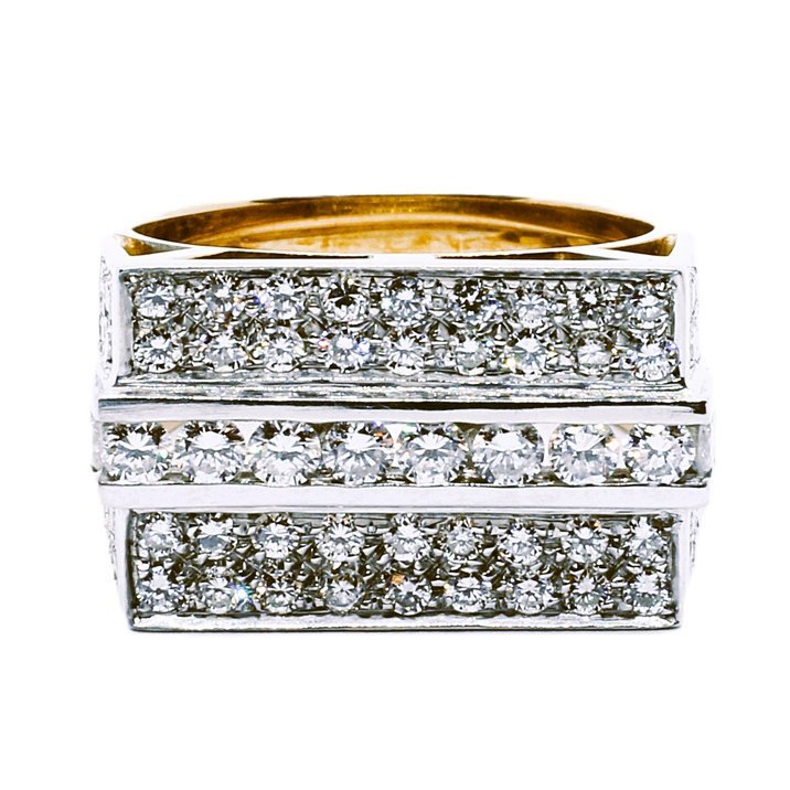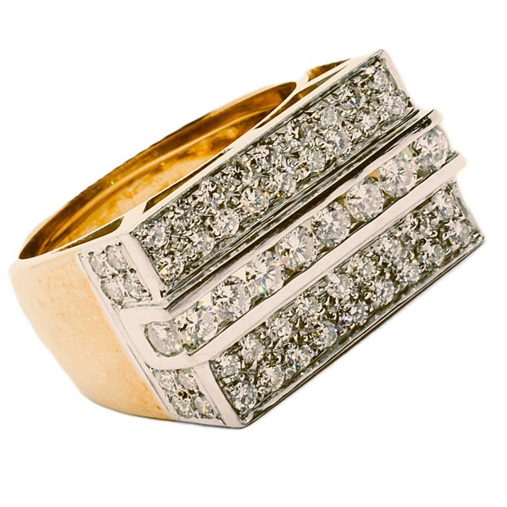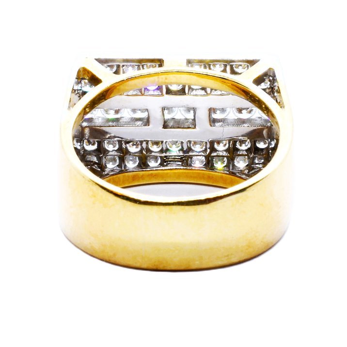Anello in oro giallo 18kt e 62 diamanti taglio brillante di ottima qualità per una caratura complessiva di carati 1,44 ca. La misura al dito (sempre modificabile) è 18/58, il peso dell'anello è di 11,67 grammi.