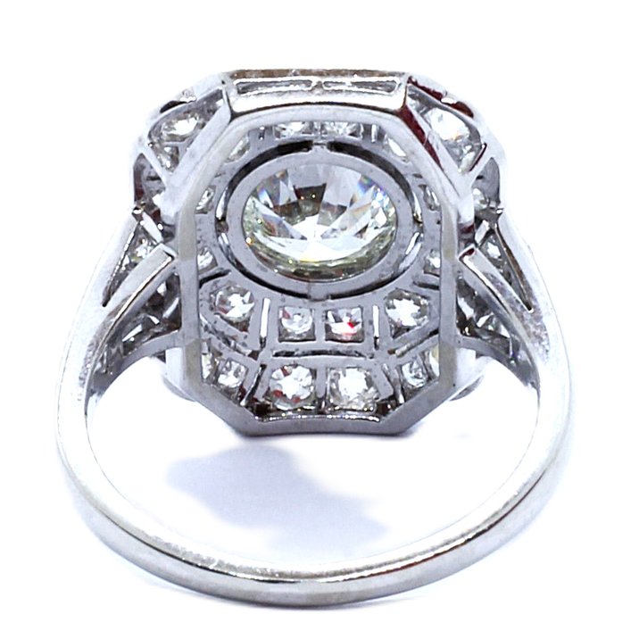 Anello in oro bianco 18kt e diamanti. La pietra di centro è un diamante taglio brillante di 1,25 ct. ca. Le pietre di contorno sono diamanti taglio "single" e "table cut" per un totale di altri 0,65 ct. ca. Peso gr. 4,22. Corredato di Certificato Gemmologico.
