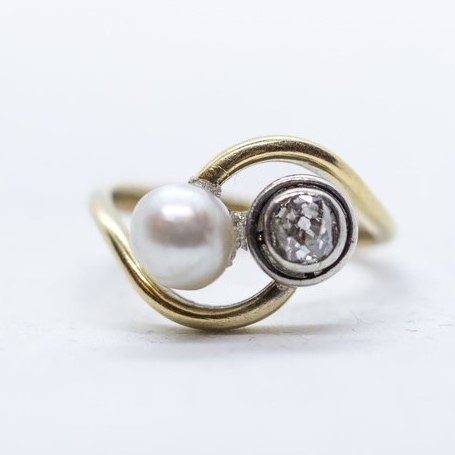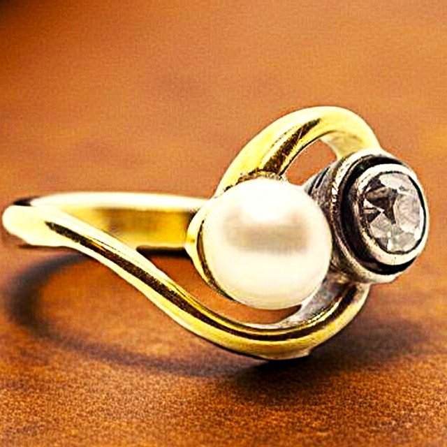 Anello contrariè antico in oro 18kt e una piccola cornice in argento a contorno di un diamante da 0,40 carati circa taglio "old mine" ed una perla da 6,20mm di diametro. Misura 12/52. Peso gr. 4,38.