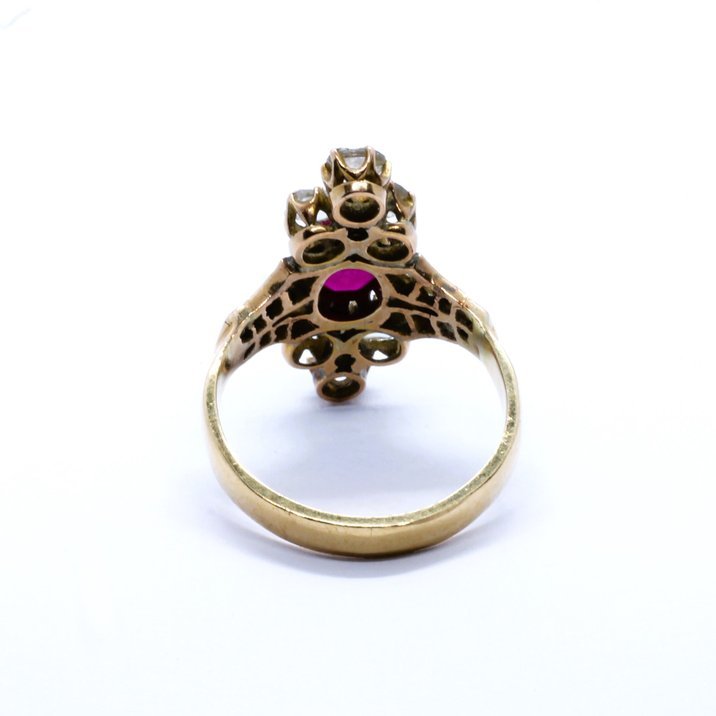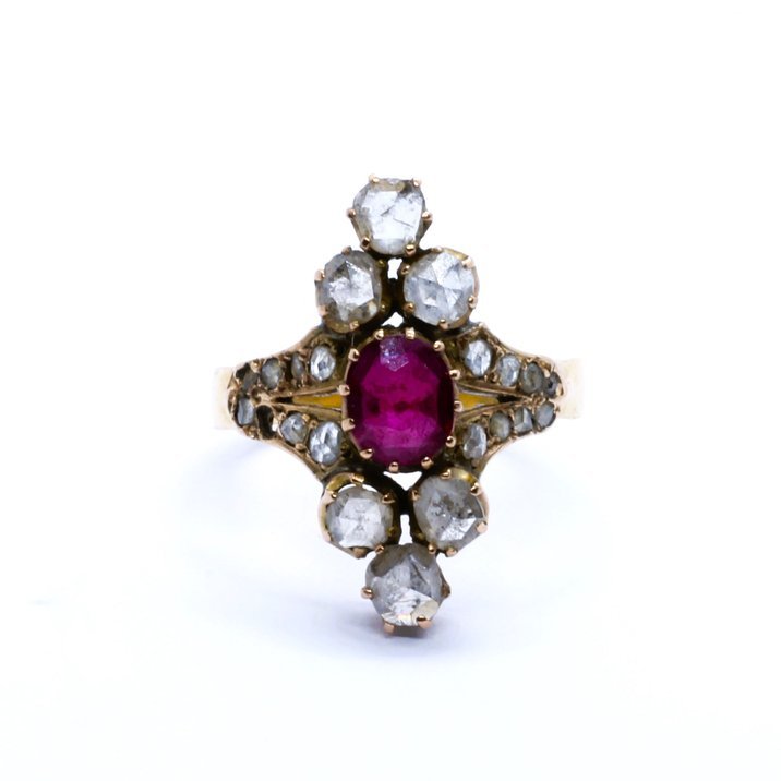 Anello antico in oro giallo 18kt, diamanti taglio rosetta per 1,5 carati ca. e rubino da un carato ca. Lunghezza max mm 25,0; larghezza max mm 18,0. La misura al dito è 21/61 e 6,90 grammi il peso totale dell'anello. Fine dell' 800 primi del 900.