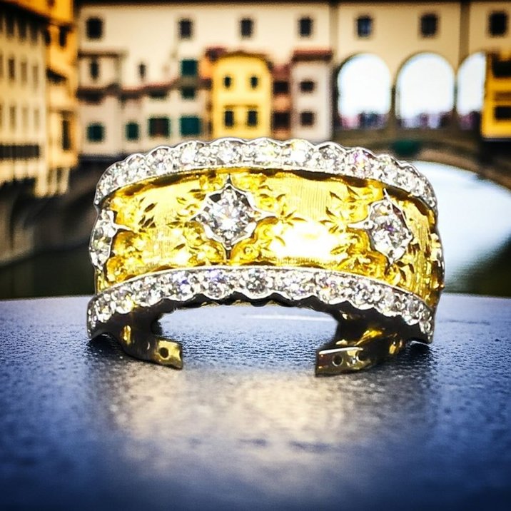 Realizzato nel classico stile Buccellati. Anello in oro giallo e bianco 18kt e diamanti taglio brillante per 1,20 ct. ca. Pesa 7,66 grammi.