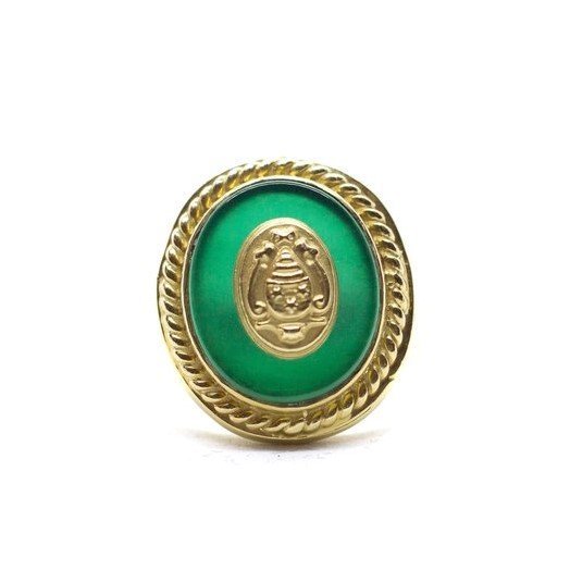 Anello in oro giallo 18kt con un piccolo stemma in cornice di giada. Misura 13/53. Peso gr. 6,03.