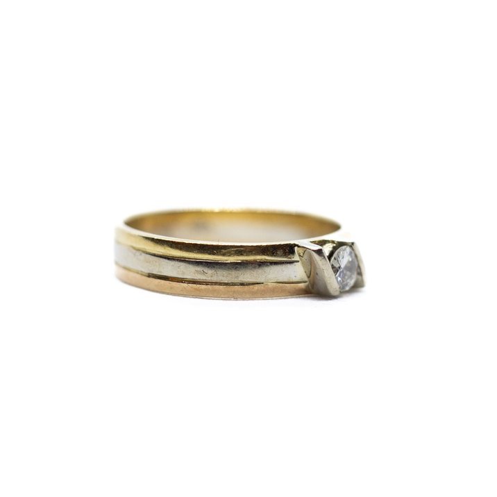 Anello da mignolo in oro giallo e oro bianco entrambi 18kt e un bel diamante taglio brillante di carati 0,15 ca. Misura, sempre modificabile, 11/51. Peso gr. 3,41.