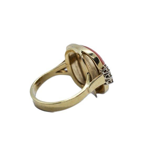 Anello in oro giallo 18kt, corallo e diamanti taglio brillante. Lunghezza max 20,40 mm; larghezza max 17,84 riferito alla testa dell'anello. 17/57 sono le misure della vestibilità e 10,08 grammi è il peso complessivo.