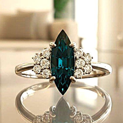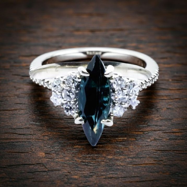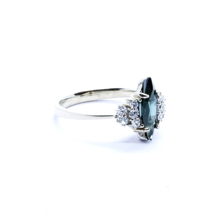 Anello in oro bianco 18kt con dieci diamanti taglio "single cut" e zaffiro centrale taglio "navette". Misura (sempre modificabile) 11/51.