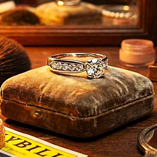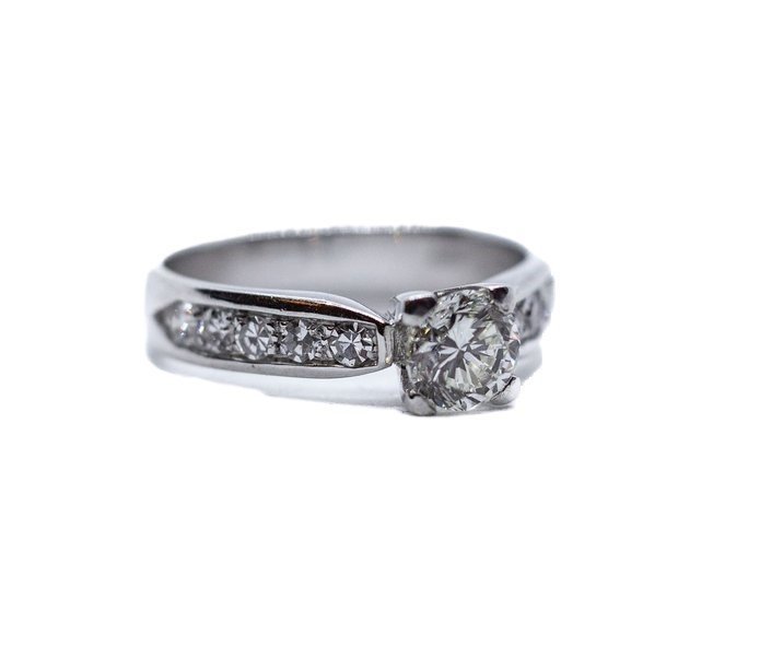 Anello in oro bianco 18kt. Centrale di 0,50 carati circa di altissima qualità per purezza, grado di colore e taglio. Fanno da contorno dieci diamanti più piccoli "single cut". La misura, sempre modificabile, è 8/48 e il peso è di grammi 3.46.