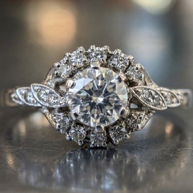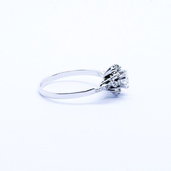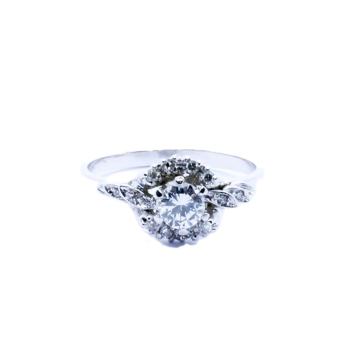 Anello in oro bianco 18kt, centrale un diamante taglio brillante di 0,40 ct. ca. e dodici diamanti "single cut" come pietre di contorno. Misura 16/56. Peso gr. 3,19.
