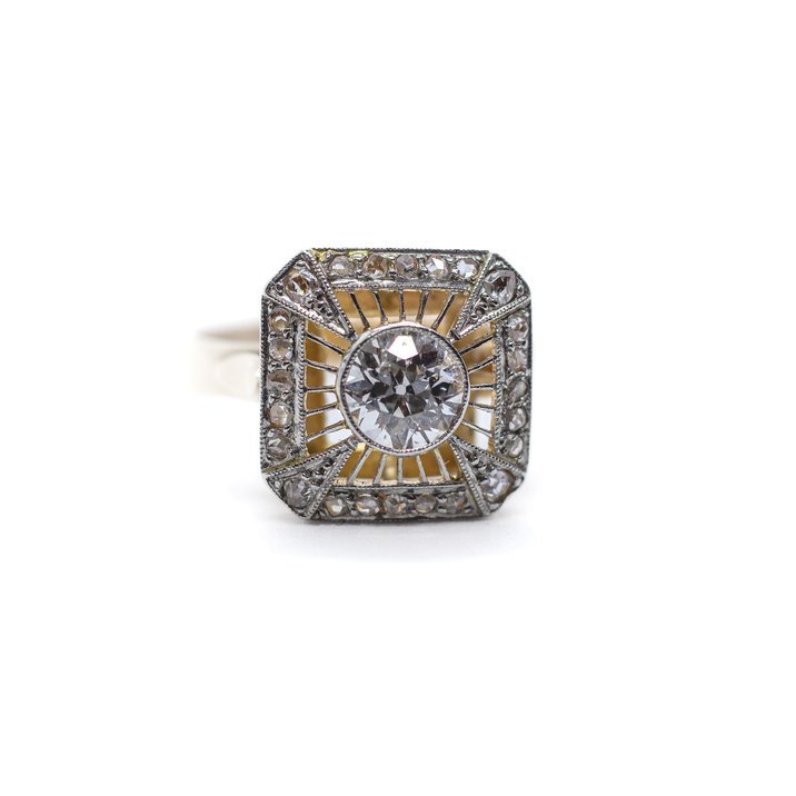 Anello in oro giallo 18 Kt e diamanti. La pietra di centro, un diamante taglio "old mine" del peso di circa 0,85 ct, è incorniciato in oro bianco 18 Kt. Inoltre vi sono, come pietre di contorno incastonate sulla cornice del castone, 24 diamanti taglio rosetta per un totale di circa mezzo carato. Arte orafa italiana degli 40 del secolo scorso. E' corredato da Certificato Gemmologico attestante la qualità e le caratteristiche delle pietre.
