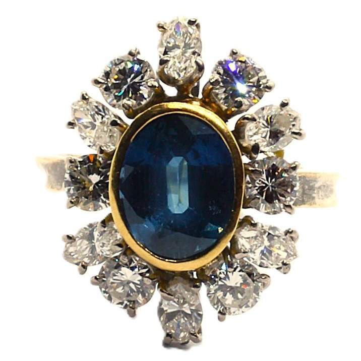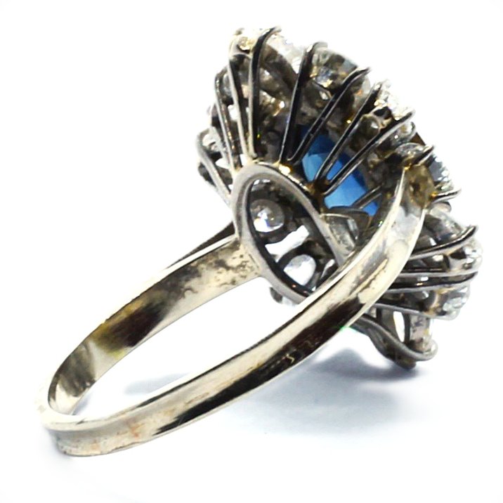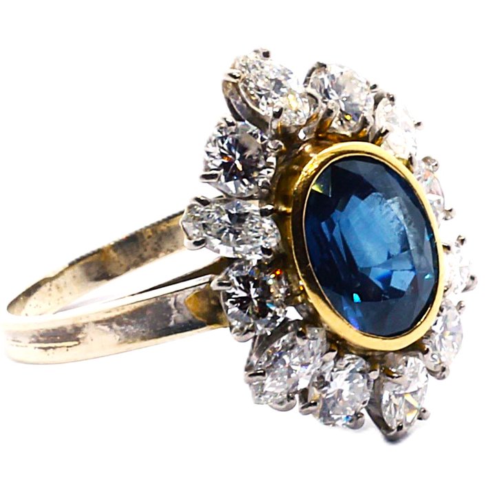 Anello "Margherita" in oro bianco e giallo 18kt, zaffiro ( 3,0 ct. ca.) e diamanti taglio marquise e round brilliant per 2,5 carati ca. Bellissima la qualità delle pietre. La misura al dito (sempre modificabile) è 14/54, il peso totale dell'anello è di grammi 5,87.