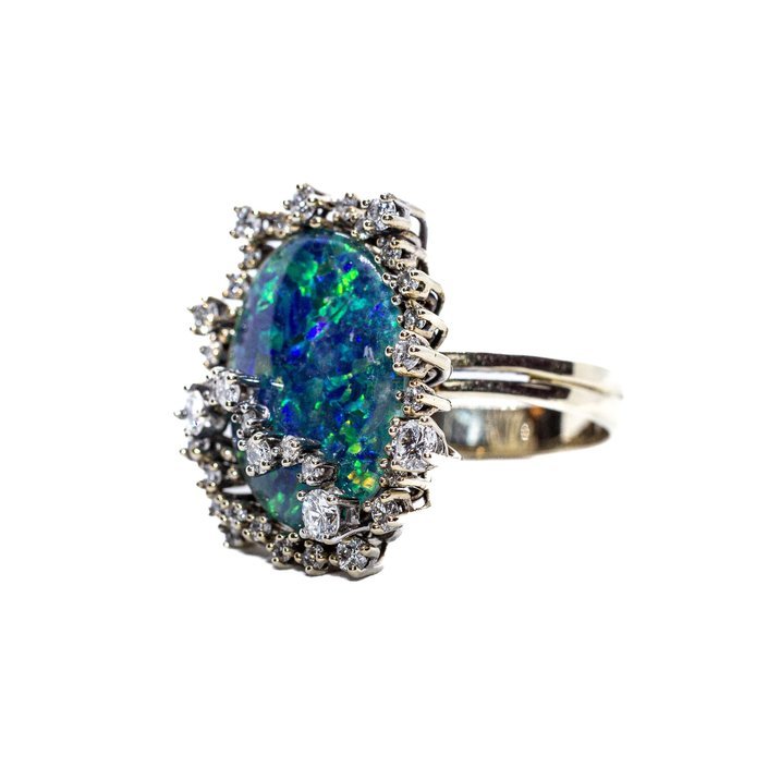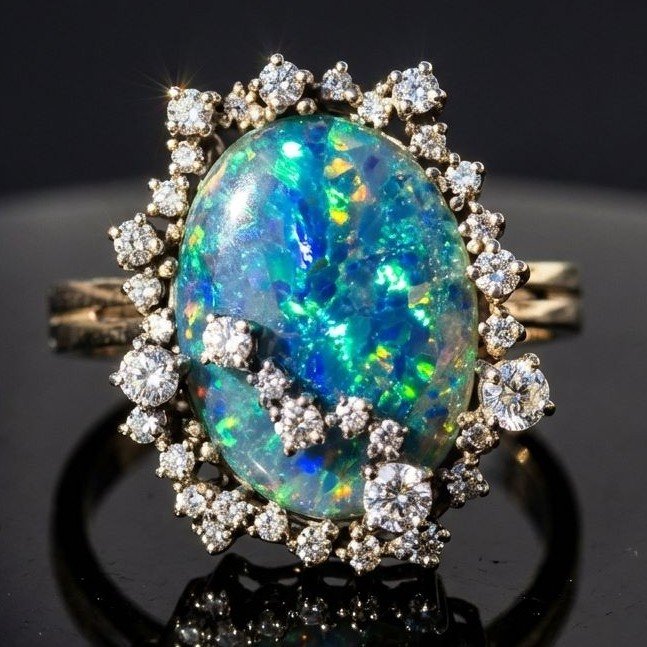 Anello in oro 18kt con opale nobile nero e diamanti tg. brillante per una caratura complessiva di 0,90 carati circa. Mis. 19/59. Peso gr. 15,13.