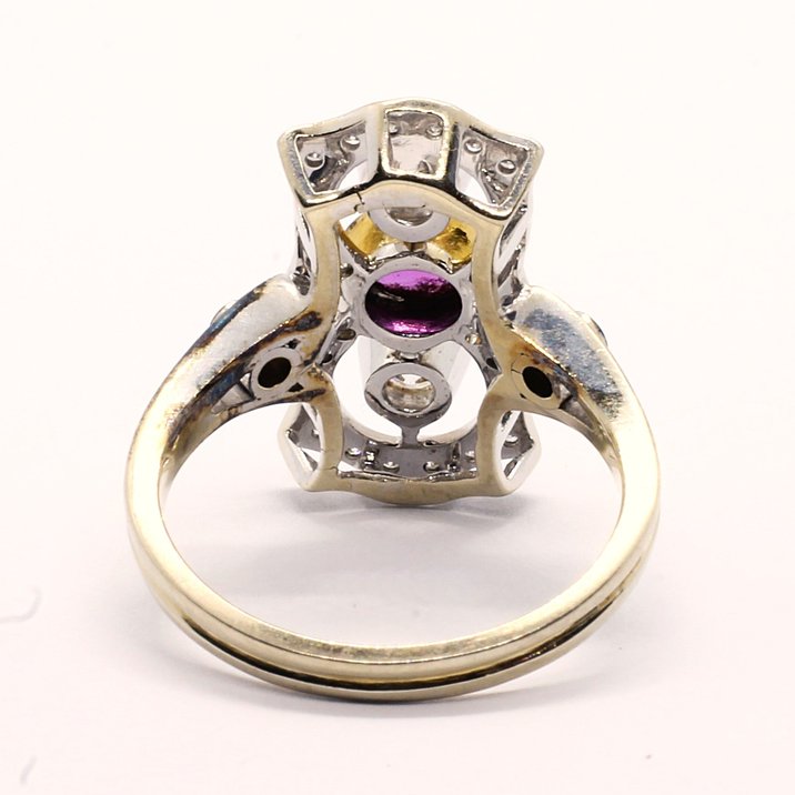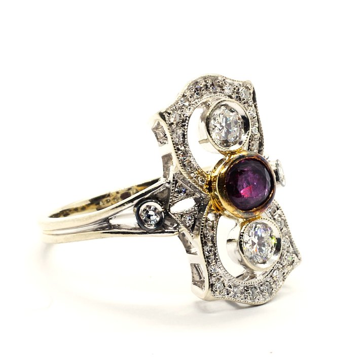 Anello in oro bianco 18kt, due diamanti taglio brillante per 0,40 carati ca. e un rubino come pietra di centro. Vi sono inoltre altri due diamanti taglio brillante e diamanti "single cut" sulla cornice della montatura. Il totale dei diamanti raggiunge 0,75 carati ca. Peso gr. 5,42.