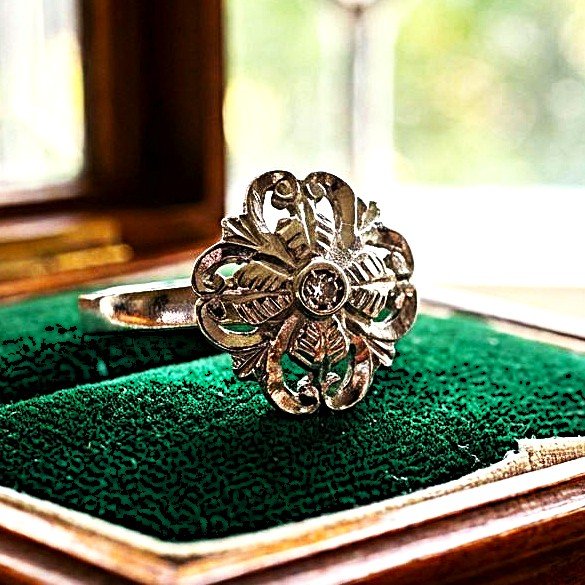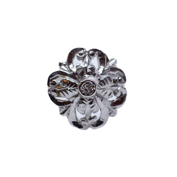 Anello in oro bianco 18kt (lavorato a bulino, cesello e traforo) e piccolo diamante taglio brillante. Misura 14/54. Peso gr. 2.22.