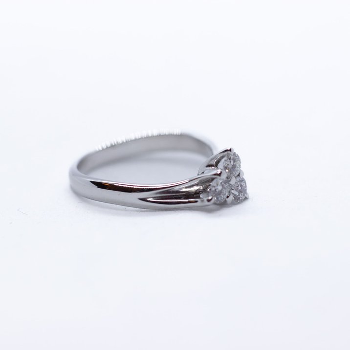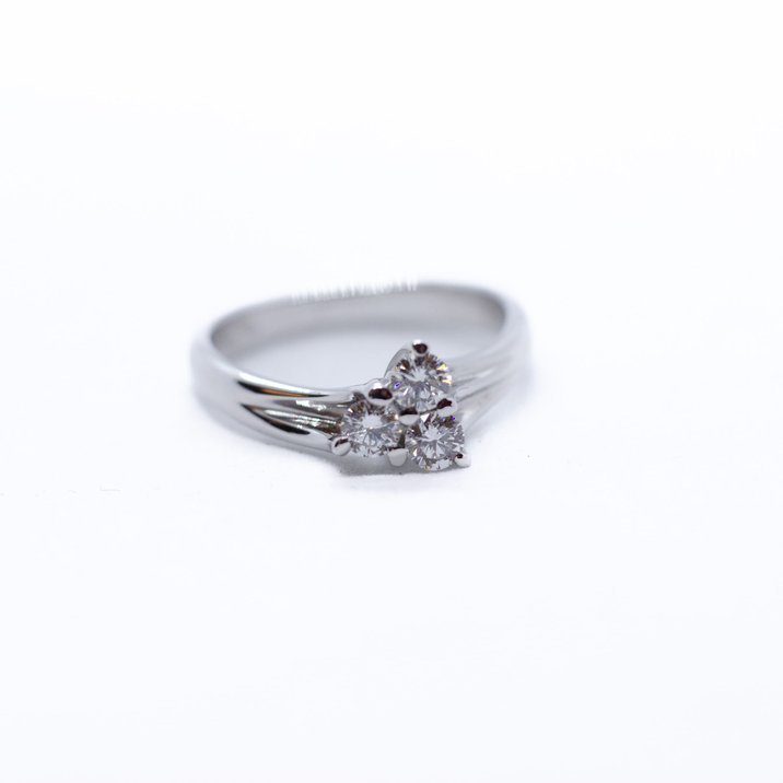 Anello in oro bianco 18kt che monta tre diamanti molto belli di 0,10 carati ca. cadauno tagliati a brillante. La misura dell'anello, modificabile, è 12/52 ed il peso è di grammi 3,82.