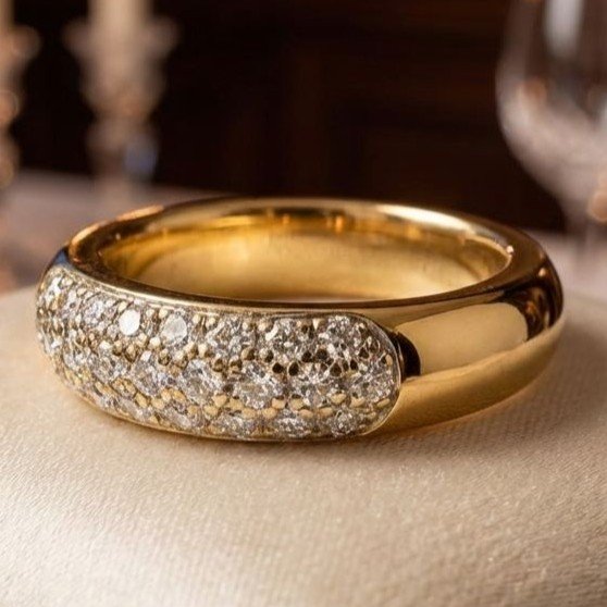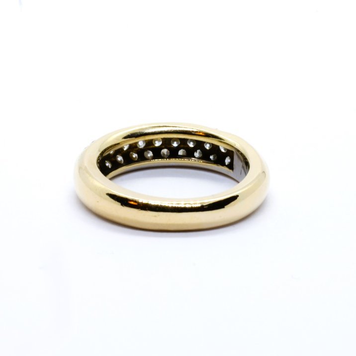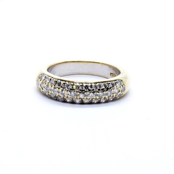 Anello in oro giallo 18kt e pavè di diamanti taglio brillante di alta qualità. I diamanti sono trentaquattro. Misura (sempre modificabile) 13/53. Peso gr. 7,33.