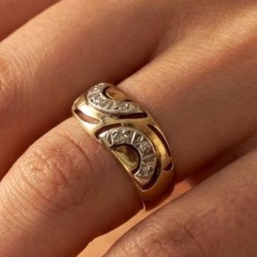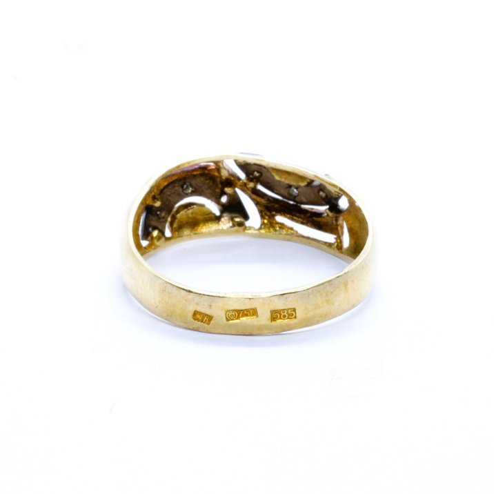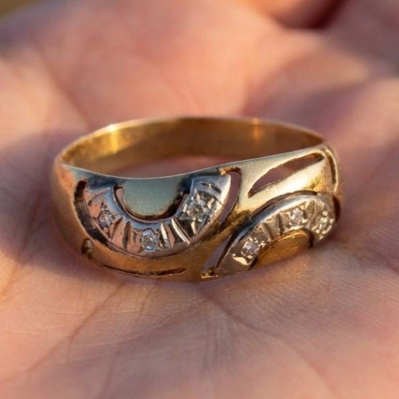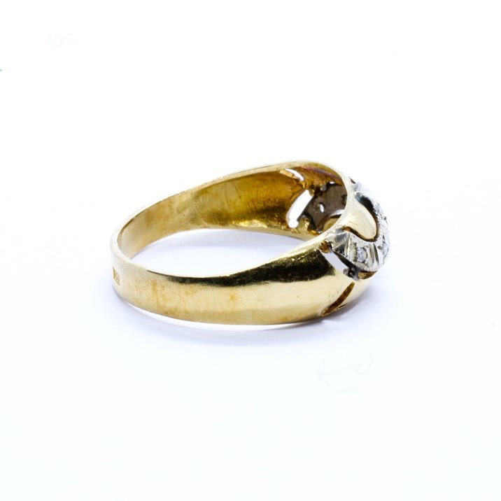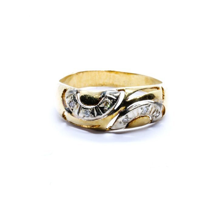 Anello in oro giallo e bianco 14kt e diamanti taglio "single cut". Mis. 19/59. Peso gr. 3,36.