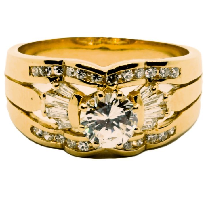 Anello in oro giallo 18kt con centrale da 1 carato taglio "round brilliant" e come pietre di contorno diamanti taglio "tape" e "round cut" per un altro carato circa. Pesa gr.10,93.