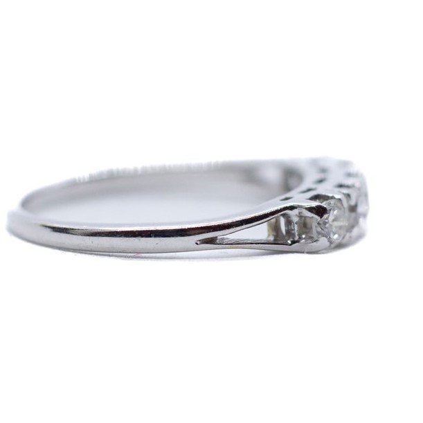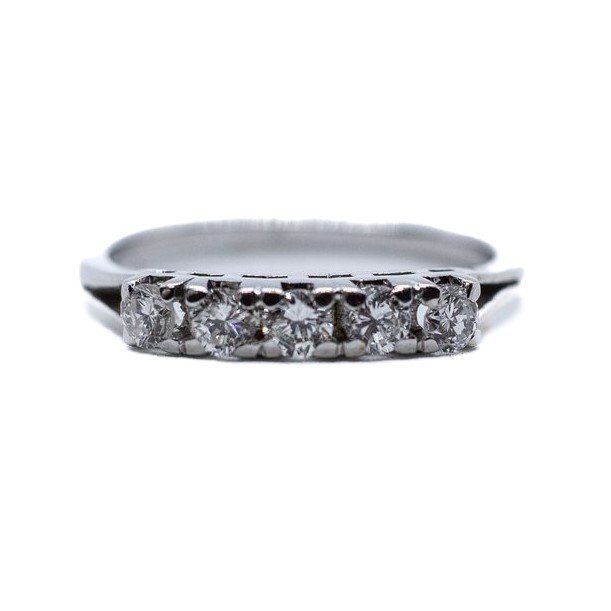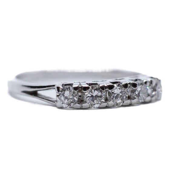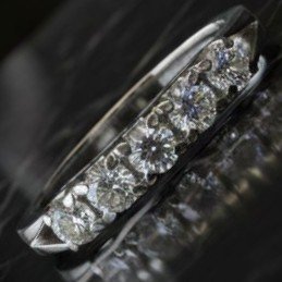 Riviera in oro bianco 18kt con cinque diamanti tg. brillante di buona qualità per una caratura complessiva di 0.45 carati circa. La misura al dito è15-16/55-56. Il peso totale è di grammi 2.56.