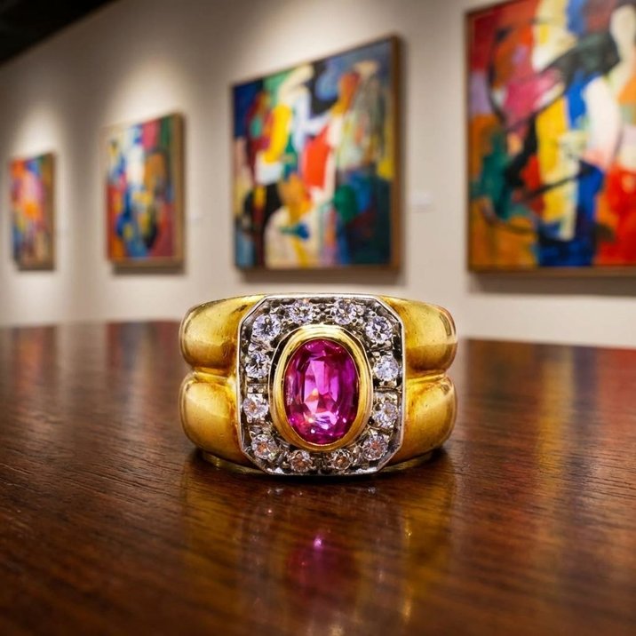 Anello anni 50 in oro giallo 18kt, splendido rubino da 1,0 ct. e 12 diamanti taglio brillante a contorno per 0,40 ct. Peso gr. 8,99.