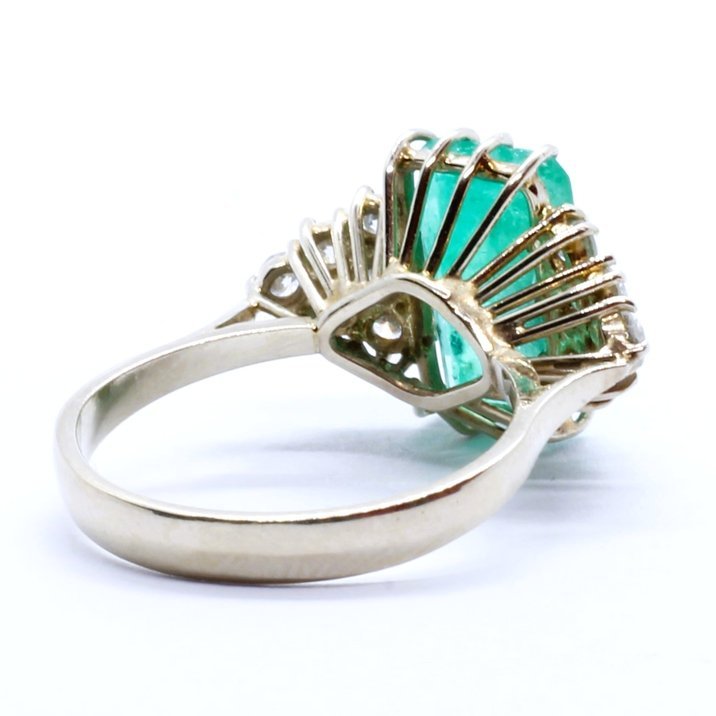 Anello in oro bianco 18kt, smeraldo (4,50 carati di bellissima qualità) e diamanti taglio brillante. Pesa gr. 4,98.