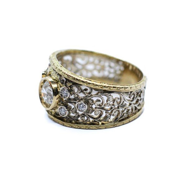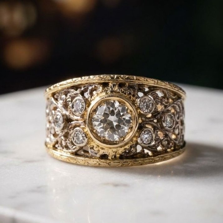 Nella prima metà del secolo scorso agli artigiani che lavoravano per Buccellati talvolta accadeva di farlo anche per conto proprio. E' il caso di questo bellissimo anello in oro giallo e bianco 18kt realizzato a traforo, bulino e cesello nel classico stile che rendeva la lavorazione simile ad una trina, al ricamo d'un merletto. Vi sono incastonati un diamante "old mine cut" da un carato circa e sei diamanti taglio "round brilliant" come pietre di contorno. E' fornito di Certificato Gemmologico.