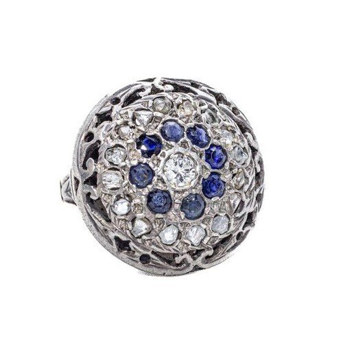 Anello cosiddetto "toppa" in oro 18kt, argento, zaffiri, diamanti taglio rosetta e al centro un diamante "round cut" di 0,10 ct. ca. Gr.5,31. 1940 circa.