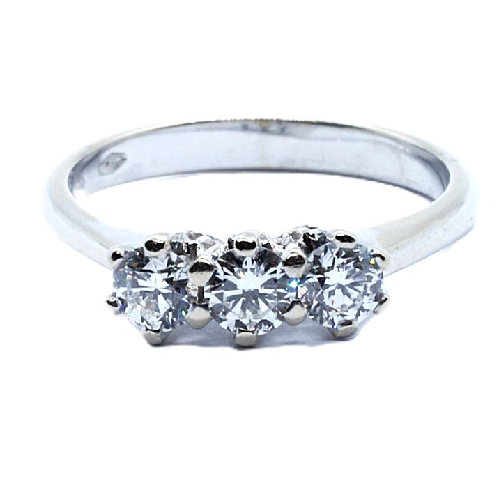 Anello "trilogy" in oro bianco 18kt e diamanti taglio brillante per una caratura complessiva di 0,60 carati ca. La misura al dito (sempre modificabile) è 15/55, il peso 3,78 grammi.
